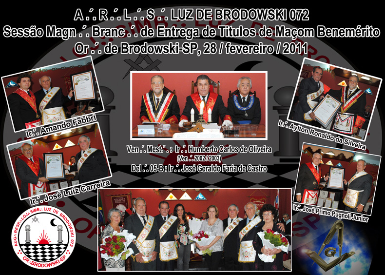 Na mesma data em que comemorava 111 anos de existência (fundada em 01 de março de 1.900), a Augusta e Respeitável Loja Maçônica Luz de Brodowski 072, Grande Benfeitora, Benemérita e Veneranda, jurisdicionada ao Grande Oriente Paulista (COMAB), promoveu na memorável noite de 28 de fevereiro de 2.011, uma sessão magna Branca para a entrega de 4 Títulos de MAÇOM BENEMÉRITO aos Irmãos fundadores da reestruturação (acontecida em 26 de junho de 1.983) : AMANDO FABBRI, AYLTON RONALDO DA SILVEIRA e JOSÉ PRIMO PUGNOLLI JUNIOR (atualmente licenciado), com 38 anos de vida maçônica, iniciados que foram em 28 de abril de 1.973, na ARLS Washington Luiz I, de Batatais-SP, e JOSÉ LUIZ CARREIRA, com 35 anos de maçonaria, também iniciado na mesma loja, em 04/04/1975.